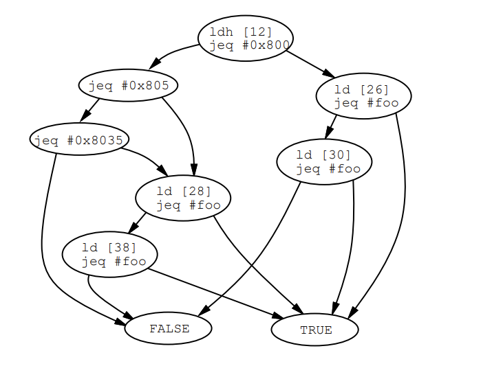 위 사진은 host가 foo인것에 대해서 확인하는 BPF CFG이다. 이런식으로 각 노드마다 명령어 셋이 존재하게 되고 명령어에 따라 패킷을 확인하고 해당 값에 따라 점프하여 노드가 분기되어 결론적으로 false or true에 도달하게 된다.