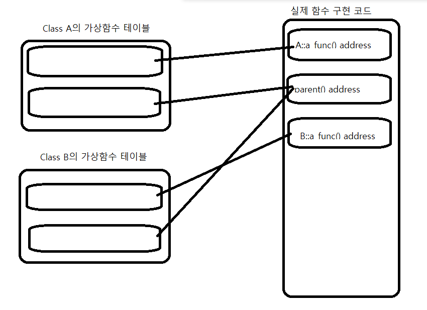 컴파일러마다 구현사항이 다르겠지만 대부분의 컴파일러는 가상함수가 구현된 클래스는 vptr를 두어 가상함수 테이블을 할당한다.