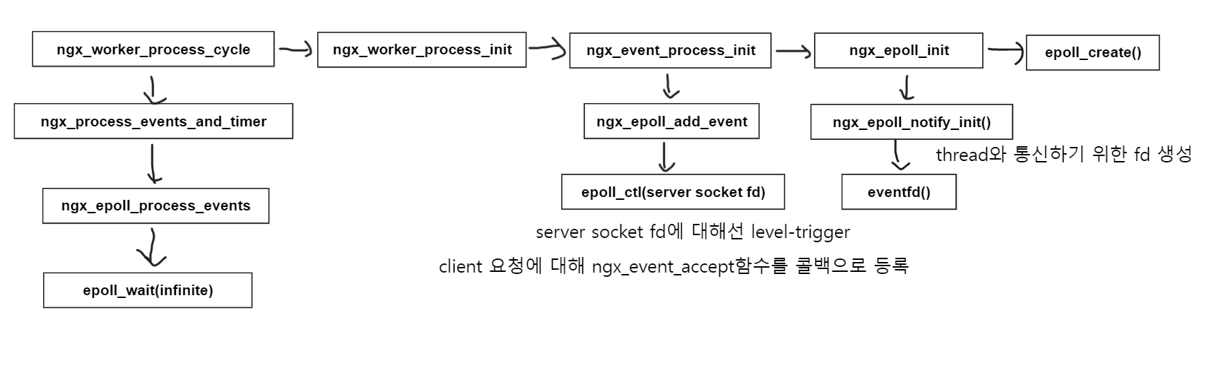 nginx 이전의 웹서버들은 클라이언트의 접속에 대해 procss or thread를 생성하여 대처했다. 하지만 nginx는 epoll event driven을 통해서 한 스레드 내에서 여러 클라이언트의 접속을 처리하는 구조를 지닌다.
